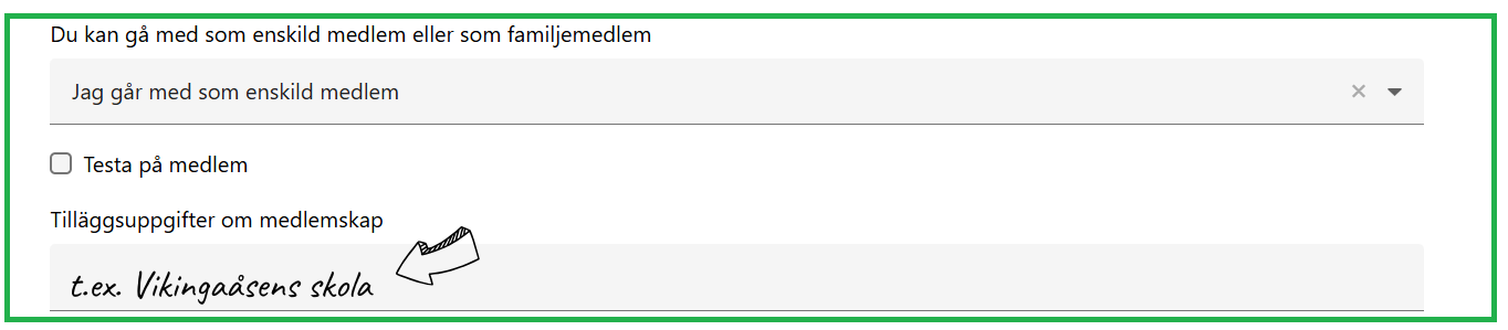OBS! För att få med vilken skola barnet går i, lägg till det på ”tilläggsuppgifter om medlemskap” efter att ni kryssat i om ni vill bli enskild eller familjemedlem.